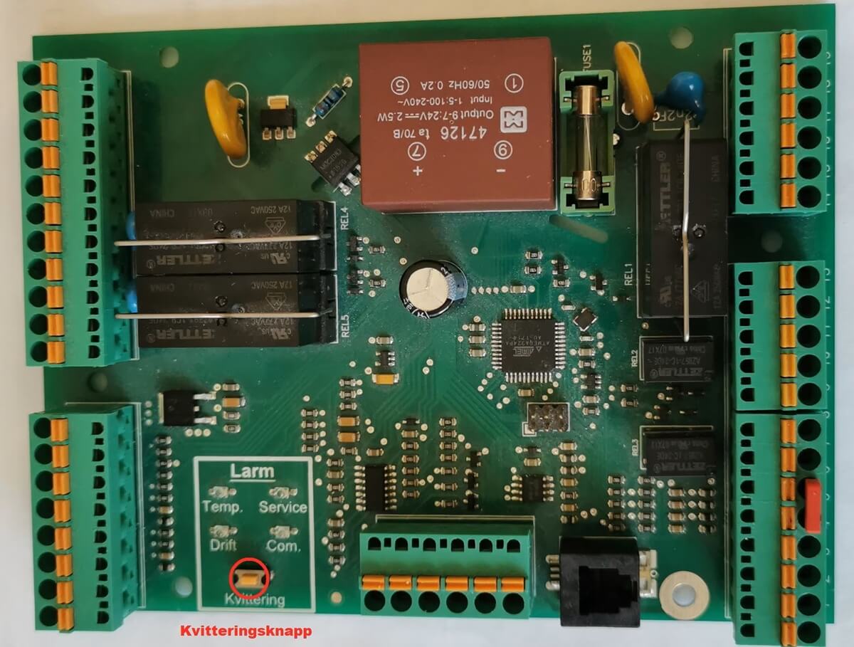 Bryt strömmen till aggregatet så att det blir helt strömlöst, öppna luckan på ventilationsaggregatet skruva även bort skyddet över kretskortet. På själva kretskortet så finns det en orange kvitteringsknapp och 4st lysdioder (se bild. För att komma in i testläget så håller man kvitteringsknappen intryckt och kopplar på strömmen, håll kvar kvitteringsknappen tills dioderna börjar blinka och då kan man släppa knappen. Du har nu kommit in i testläget och kan köra komponenterna var för sig.